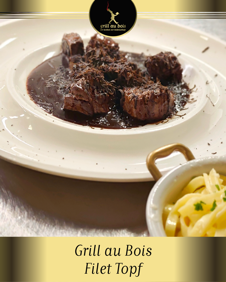 300 g kross gebratene, saftige Filetwürfel in intensiver Trüffelsauce. Dazu reichen wir frisch gehobelte Perigord Trüffel und Teigwaren.