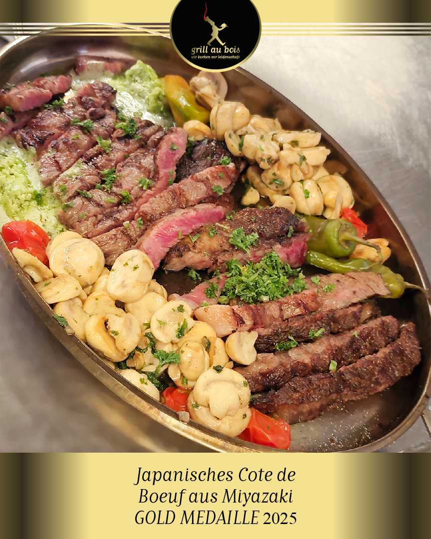 Miyazaki Wagyu hat mehrfach die „Wagyu-Olympiade“ gewonnen und gilt unter Kennern oft als noch exklusiver als das bekanntere Kobe-Beef. Ein T-Bone in dieser Qualität (A5) ist eine Rarität: