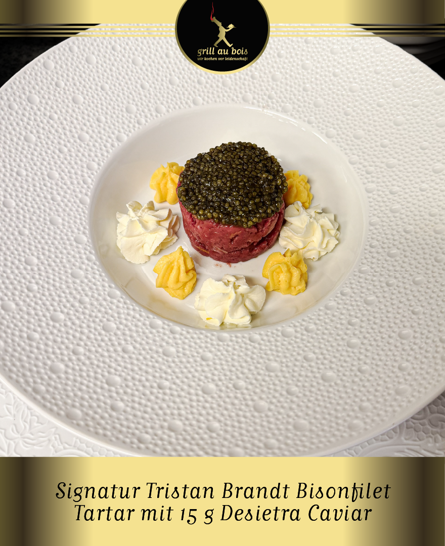 Das Tartar mit Kaviar von Tristan Brandt ist ein kulinarisches Meisterwerk, das die Expertise und Kreativität dieses renommierten Spitzenkochs repräsentiert. Tristan Brandt hat es geschafft, das klassische Tartar auf ein neues Niveau zu heben, indem er es mit dem exquisiten Geschmack und der Raffinesse von Kaviar verbindet. Die Zubereitung dieses Gerichts erfordert ein hohes Maß an Finesse und Fachwissen. Tristan Brandt wählt sorgfältig das hochwertigste Rindfleisch aus und zerkleinert es zu einer perfekten Textur, die zart und geschmeidig ist. Die Zugabe von ausgewählten Gewürzen und Aromen verleiht dem Tartar eine unverwechselbare Geschmacksnote