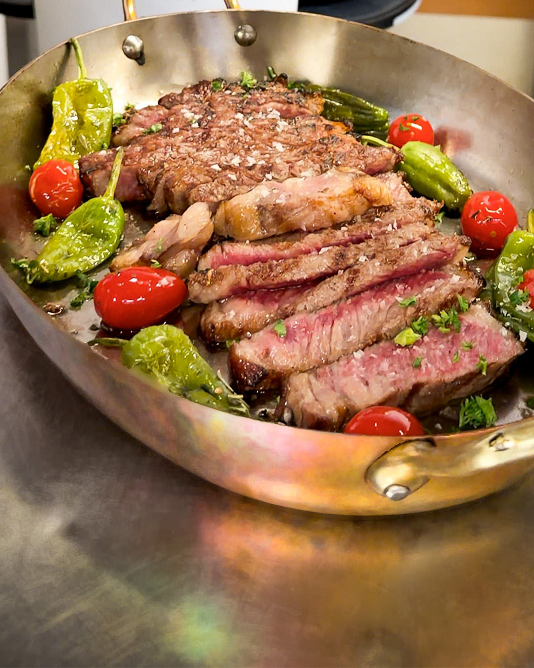 Der perfekte Begleiter zum Steak. Die Zwiebeln werden langsam bei niedriger Hitze in der Gusspfanne gedünstet. Kurz vor dem Anrichten karamellisieren wir mit Ahornsirup.